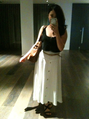 Poor quality from my iPhone camera, but a quick snap before I head home from work while waiting for the elevator. Was in the mood for something non-corporate today considering there wasn't really the need to today without any major occurances in the office that would have required me to dress so. But loving the casual day today. White waisted vintage maxi skirt and a black cropped tank untucked, creme leather belt to match the buttons on the skirt and black elastic sandals. As basic as it can get for today's warm weather. Feeling rather girly today...
